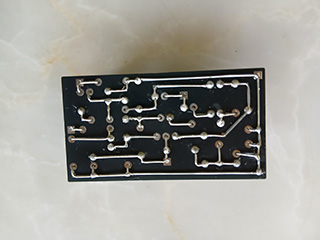 基板の裏にはシルク印刷でパターンが描かれています。このパターンのラインに沿ってリードを曲げて結線していきます。