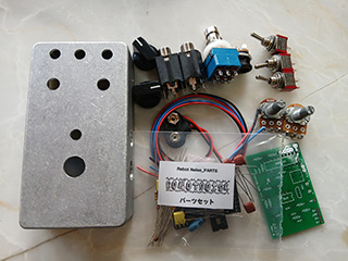 専用プリント基板とパーツ、ポットのセットです。写真以外のパーツは付属しません。キットマニュアルが付属します。